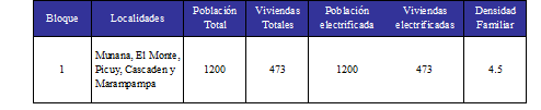 La población electrificada alcanza un total de 1200 pobladores con un total de 473 viviendas domésticas por ser electrificadas. Se estima que la población dentro de 10 años será de 3909. El detalle se muestra a continuación: